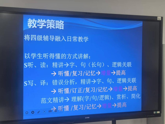 罗季美老师聚焦“将四级辅导与日常教学融合” 主题,从学情分析破题,全面剖析学生英语学习能力各维度,涵盖语音、词汇量、语法、听读写译能力等,以及成功意愿、努力程度等关键因素对教学成果的影响。她提出将四级辅导有机融入日常教学的教学策略,强调以学生易懂方式讲解,无论是听读还是写译,都要精讲字、句、逻辑关联,通过听懂、复习、记忆等环节实现知识增量与能力提升。罗老师还分享四六级辅导课具体案例,为参会教师提供极具价值的实践经验。