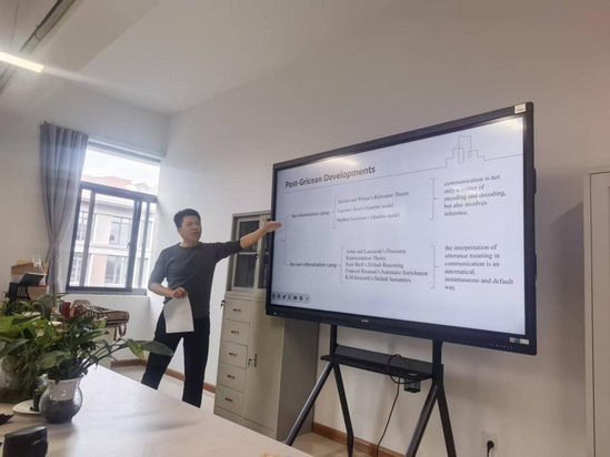 张耀庭老师以“缺省 / 默认意义” 为切入点,开启了一场语义学文献导读之旅。他围绕格莱斯合作原则、会话含义理论展开,细致拆解自然意义与非自然意义的差异,深入探讨语境在话语完整意义推导中的关键作用。张老师不仅回顾了后格莱斯时代的理论演进,涵盖 Sperber 和 Wilson 理论、Levinson 三原则等,还结合实例深度剖析默认语义学在话语意义分析中的应用优势,为参会者打开全新研究视野,激发大家对语言交际本质的深入思考。
