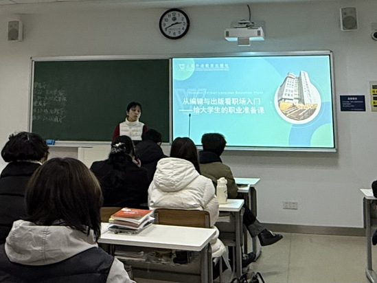 2025年12月1日,语言文化学院邀请日语专业行业导师--上海外语教育出版社副总编王一佼--在日华楼252教室以“从编辑与出版看职场入门——给大学生的职业准备课”为主题,为在校学生带来了一场富有启发性的职业准备课。